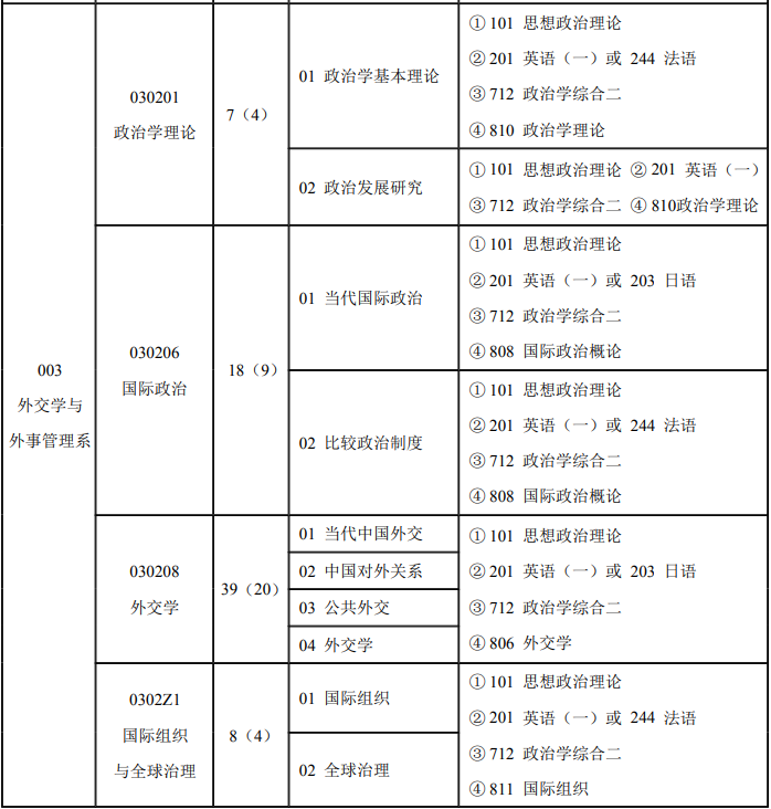学校具有政治学一级学科博士学位授权点,下设国际关系、外交学、国际政治、政治学理论4个二级学科;具有政治学、外国语言文学、理论经济学、法学、国家安全学5个一级学科硕士学位授权点,下设国际关系、外交学、政治学理论、国际政治、国际组织与全球治理、国际安全、科学社会主义与共产主义运动、英语语言文学、日语语言文学、法语语言文学、外国语言学及应用语言学、世界经济、西方经济学、政治经济学、国际法学、刑法学、民商法学、经济法学等18个二级学科;还具有翻译硕士、法律硕士和金融硕士3个专业硕士学位授权。其中,国际关系、国际法学为1981年国务院批准的首批硕士学位授权点,1984年开始招收国际关系博士研究生,2003年获得外交学博士学位授权。