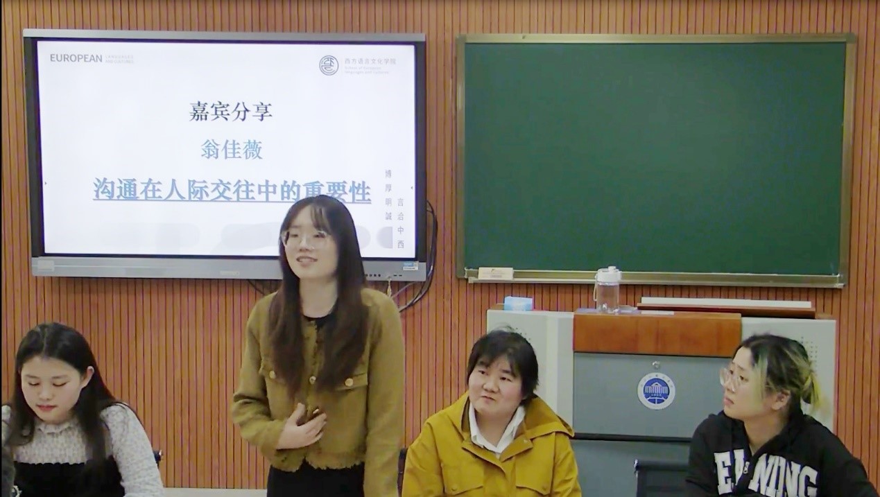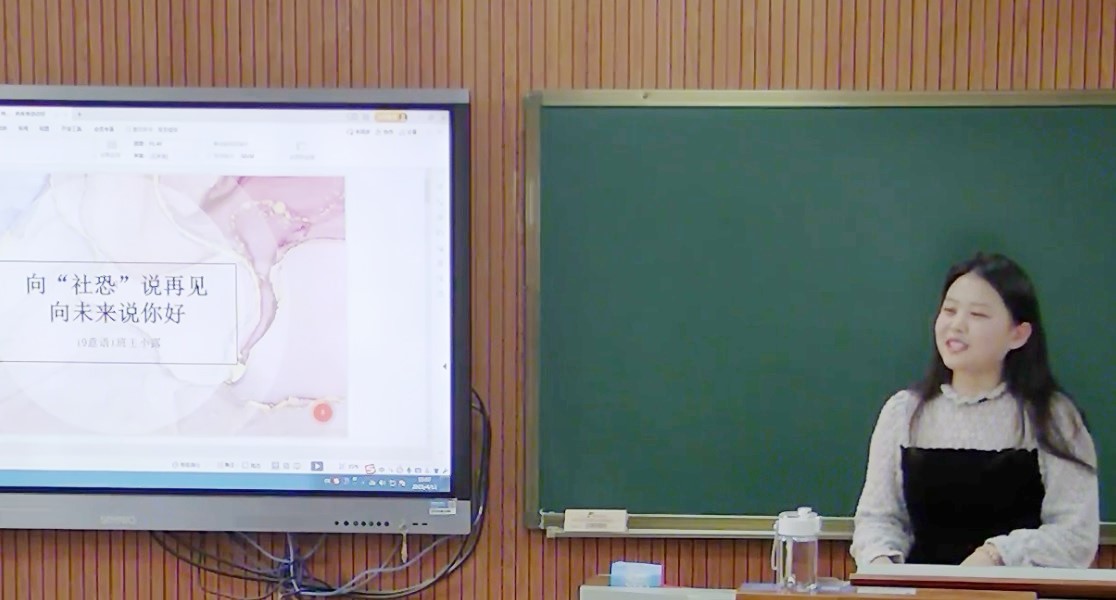 目前在杭州瑅客公司担任猎头助理的19意语1班王小露同学结合工作经验,从大学生社交能力与职业发展的关系的角度,以《和“社恐”说再见,和未来说你好》为题作分享。她指出:步入职场以后,社交的频率更高,也影响更大,因此社交能力成为了职场必备的重要能力之一;她从聚光灯效应、自我怀疑、完美主义、高敏感性分析了“社恐”的原因及克服办法,围绕职场,她指出职场“社恐”可能会影响面试,导致错失机会,影响团队人际交往,进而影响自我发展;她就如何克服职场“社恐”,把握社交的“度”提出了可行建议,鼓励大家勇敢迈出第一步。
