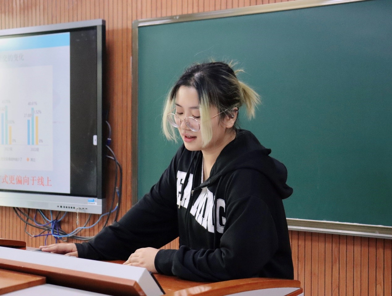 逾300位学生做自我社交状况的认知情况调查(问卷调查、视频采访)。学院党员之家活动部负责人21俄语2班胡宇可同学首先汇报了调研情况,并分析指出:进入大学后,随着社交软件的多样化及更多频次使用,同学们线上交流变多了,朋友圈扩大了;然而同学们在面对交往中产生的矛盾时,处理方式差异较大,还越来越多地呈现了回避直接面对面沟通、更喜欢隔空喊话等新特点。之后,播放了前期关于“线下社交VS线上社交,你怎么看?”的校园采访视频,采访中,同学们分享了对于网络社交的态度,大部分被采访者都表示确实网络社交越来越多,也越来越影响生活,但是目前仍然是现实生活中直接互动的人际关系更牵动心绪、耗费精力。