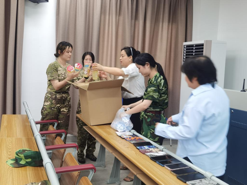 老师和教官们一同给每位同学送上柠檬水,给同学们带来酷暑中的一份清凉。