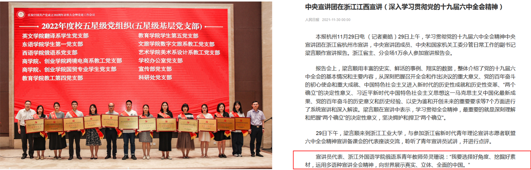 俄语系党支部于2018年经党总支改组原有支部设置。支部于2021年入选浙江省第二批全省高校党建工作样板支部。2023年7月顺利通过验收。支部现有党员10人,其中俄语专业教师党员均为博士。