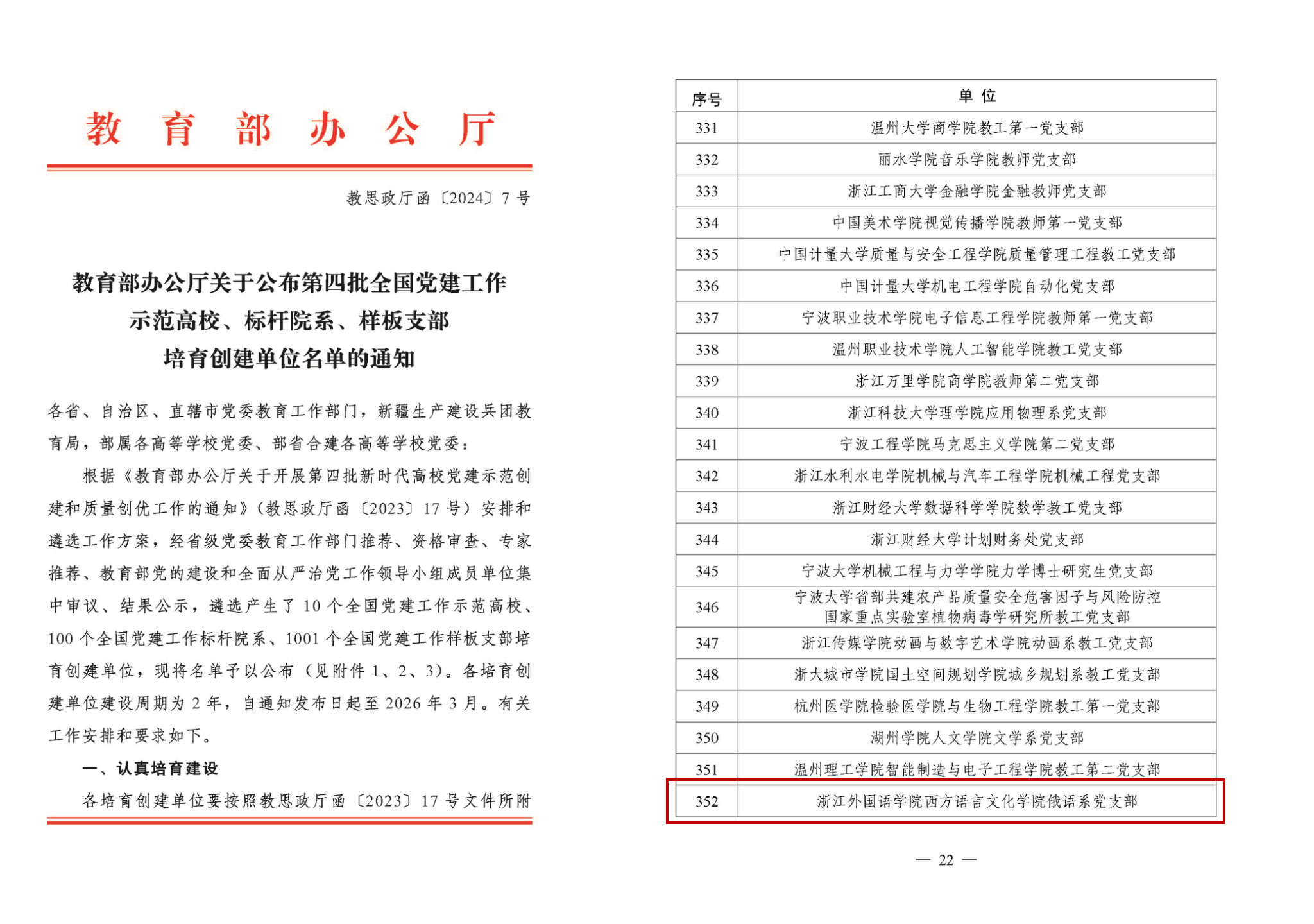 俄语系党支部入选“全国党建工作样板支部”培育创建单位。