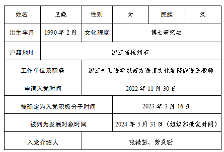 党总支俄语系党支部党员大会研究,报学校党委组织部备案同意,将卫晓同志列为发展对象。根据发展党员工作有关要求,现将其有关情况予以公示。